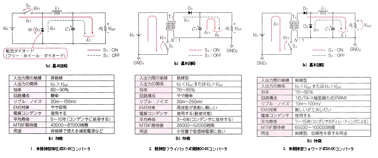 DC-DCコンバータの回路方式はいくつもありますが大きく分けると①非絶縁型と②絶縁型に分けられます。非絶縁型で一番多用されているコンバータはバック方式といわれる降圧型DC-DCコンバータです。図1の(a)がバックコンバータの基本回路です。スイッチS1にパワートランジスタ又はパワーMOSFETでスイッチング素子のON/OFF時比率を変えて定電圧制御させます。スイッチS1がONの時に電流はインダクタL1を通して付加RLに流れます。スイッチS1がOFF時にはインダクタL1に蓄積されたエネルギーが転流ダイオードD1を通して負荷へ電流が転流されて定電圧制御されます。最近ではスイッチング周波数が3MHzクラスの製品も市販され効率も90%~94%の高効率となっています。POLコンバータは一般的にこのバック型レギュレータを云っています。この方式は小型、低価格が期待できます。 絶縁型フライバックコンバータの基本回路が図1の(b)です。フライバック式コンバータは1石式のON/OFF制御のコンバータで、トランスの一次、二次巻線が逆極性に接続してスイッチング素子S1がON期間にトランスの一次側にエネルギーを蓄積してスイッチング素子S1がOFF期間に二次側巻線から放出したエネルギーを整流ダイオードD1と平滑コンデンサC1で半波整流されて直流化されます。この方式の特徴は二次側の整流がコンデンサインプットで平滑インダクタを使いません。この為、部品数が少なく価格も低減できますが低電圧大電流コンバータの場合、コンデンサのリップル電流が多くなり低電圧大電流には向きません。またチョークコイルが不要な分、絶縁トランスが大きくなる欠点もあります。この方式の特徴はトランスに蓄えらるエネルギー量を制御する方法ということになります。 図1の(C)は、フォワード方式のコンバータです。この方式は一石式ON/ON制御の方式です。一次側スイッチング素子S1がON時にトランスを介して二次側に電力を伝達させる方法です。スイッチS1がONすると同じ時比率で二次側にエネルギーが伝達され整流ダイオードD1、D2インダクタL1、そして平滑コンデンサC1によって整流され安定化された直流を得る事ができます。チョークインプットに為、平滑コンデンサC1へのリップル電流は小さく低電圧大電流に向いています。 図表に特徴を回路方式別に記載しました。非絶縁、絶縁、出力電圧電流、寿命、大きさなどそれぞれの特色を理解して使いこなす事が重要になります。