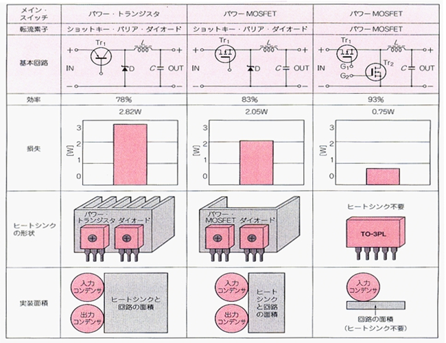 同期整流方式はここ数年、広く使われて来ました。下記図はステップダウン式のDC-DCコンバータを使って転流ダイオードを、①ハイサイド素子にトランジスタ(TR)とショットキーバリアダイオード(SBD)の組み合わせ、②ハイサイド素子にパワーMOSFETとショットキーバリアダイオード(SBD)の組み合わせ、③ハイサイド素子にパワーMOSFETと同期整流の組み合わせ、を比較してみました。図1は転流ダイオードに低VFのショットキーバリアダイオードを使って順方向損失を低減させてもトランジスタのスイッチング損失が比較的大きく効率は78%でした。 ②はメインスイッチにパワーMOSFETに変えて試験したものです。MOSFETは低オン抵抗タイプを選定しスイッチングロスを減らしたものです。効率は83%に向上しました。 最後に③の同期整流方式を試して見ました。転流ダイオードには低オン抵抗のFETを選びました。この結果効率は93%と極めて高効率になりました。結局、回路方式の選択で効率は15Wも改善できました。この比較の結果を図表のように損失グラフにして見ると発熱量の差が歴然とします。 この15Wの効率改善でヒートシンクが不要にでき、改善が可能になりました。またヒートシンクが不要になった他、プリント基板の実装面積も1/3と省面積化されました。同じスイッチングレギュレータ方式でも回路の選択でこんなに違う事が分かります。