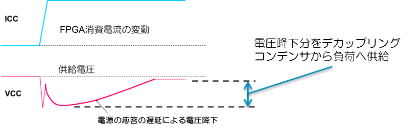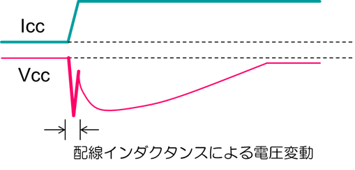 動的な要因は、急激な電流の変化で動的負荷変動として顕在化します。上図では、ICCが急激に変化した事でVCC供給電圧にディップが発生した様子を示しています。