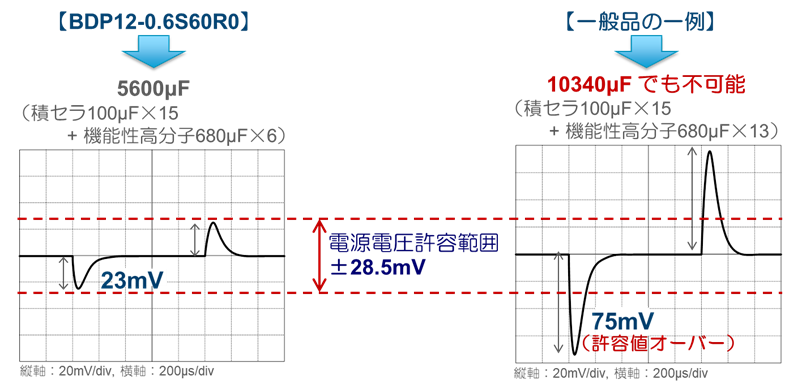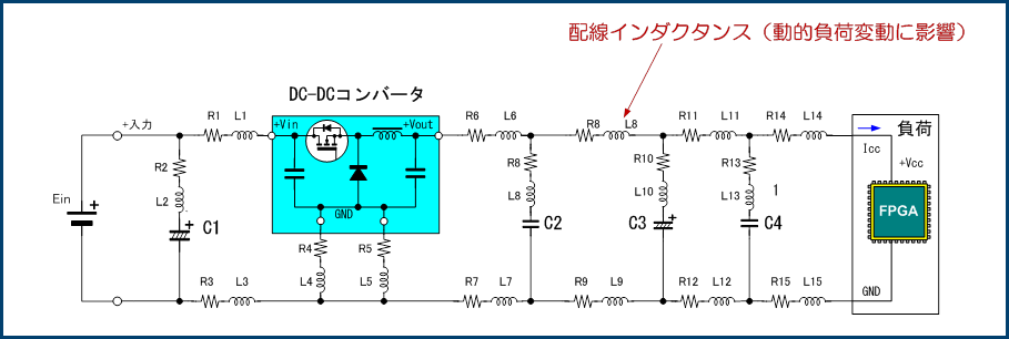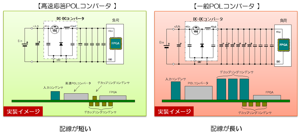 配線インダクタンスによる電圧変動は、非常に高い周波数成分のためセンシングしてもPOL コンバータで減衰させることができません。高周波特性の優れた積層セラミックコンデンサ をFPGA近傍に付加することでこの変動を抑えることができますが、配線が長すぎる場合は 抑えきれずFPGAの許容値を超えてしまいます。