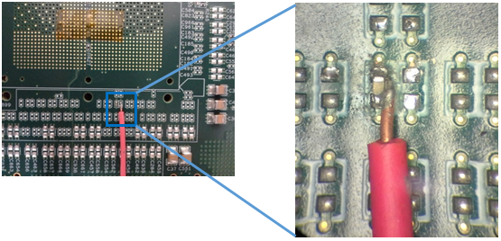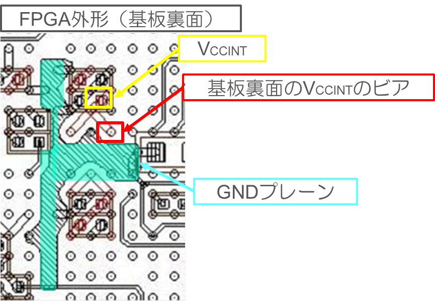 VCCINTとVCCAUXは、基板直下である基板裏面のビアでのみ観測可能です。 ビルド工法等でビアが無い場合は直近のパスコン両端で観測して下さい。下図では、VCCINT裏面でビア直近にあるパスコンの例を挙げています。 パスコン両端で波形を観測する場合は注意が必要です。セラミックコンデンサの電極は応力に対し強くありません。測定時に力がかからないよう配慮する必要があります。