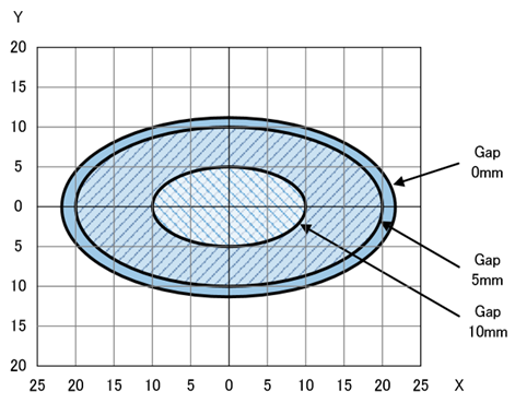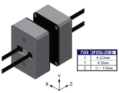 ソレノイド型のトランスの特徴として、X軸方向の位置ずれに強いです。 下記エリアにおいて、定格負荷での動作が可能です。